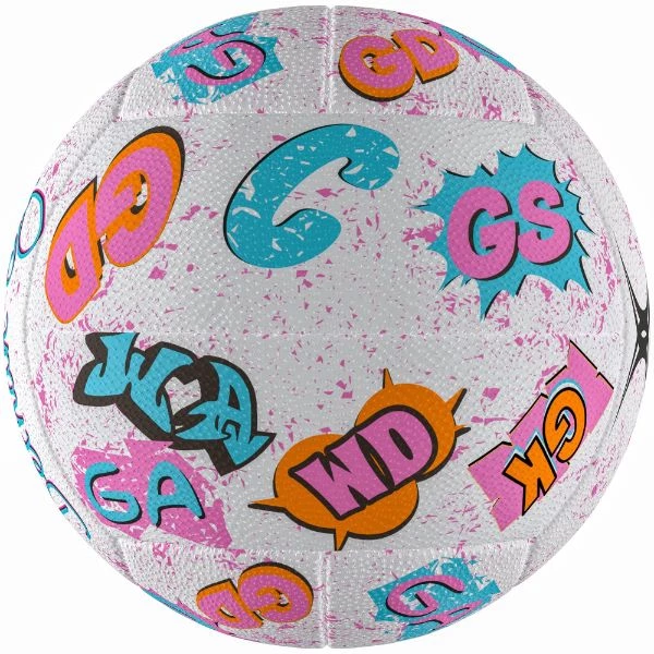 Bethan Dyke is a Wales international Centre, Wing Attack who currently players for the Superleague Team Severn Stars. Her signature ball features a white background with the netball positions featured in a graffiti-style print across the ball.